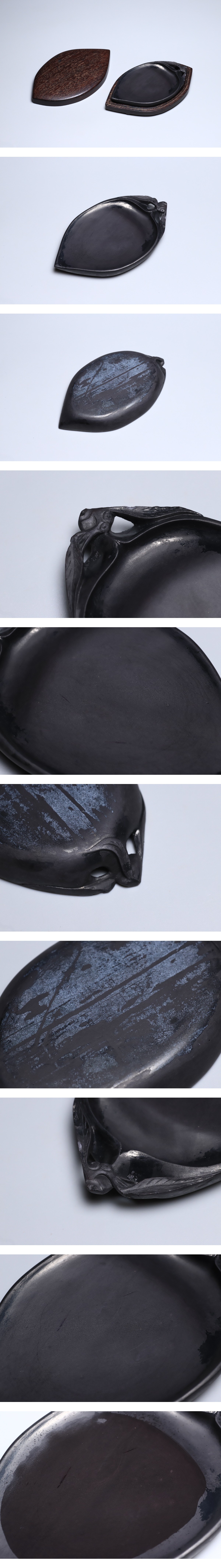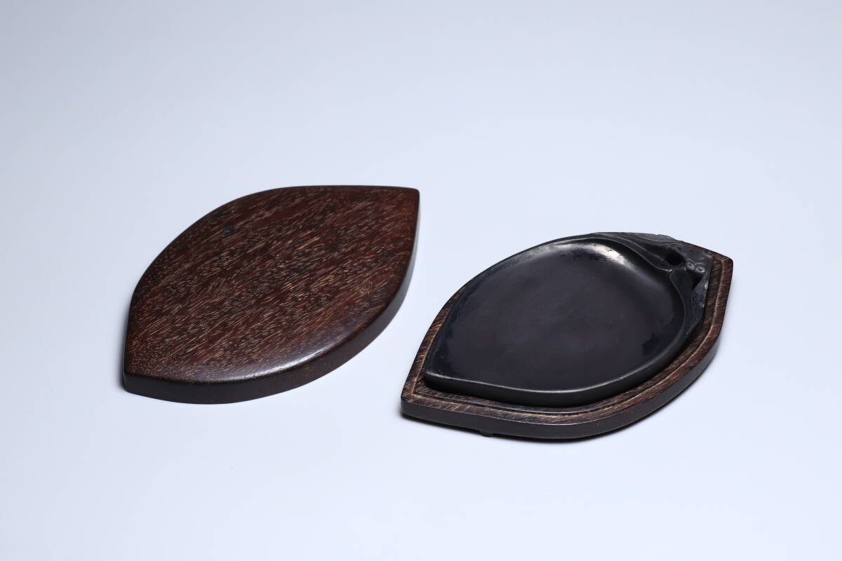 - 古硯 端渓硯 老坑 葉型彫 唐木箱 書道 時代物 端渓硯/歙州硯/古墨/古美術/骨董品 L07824