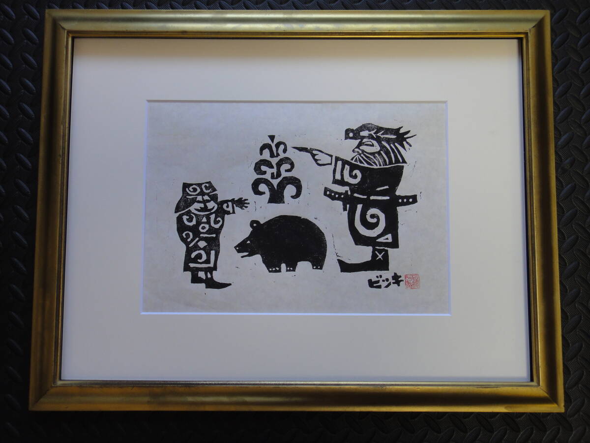 - ★ 砂澤ビッキ アイヌ エカシ メノコ 熊 版画 落款 額サイズ 約67×52㎝ ★ 検 藤戸竹喜 床ヌブリ 瀧口政満