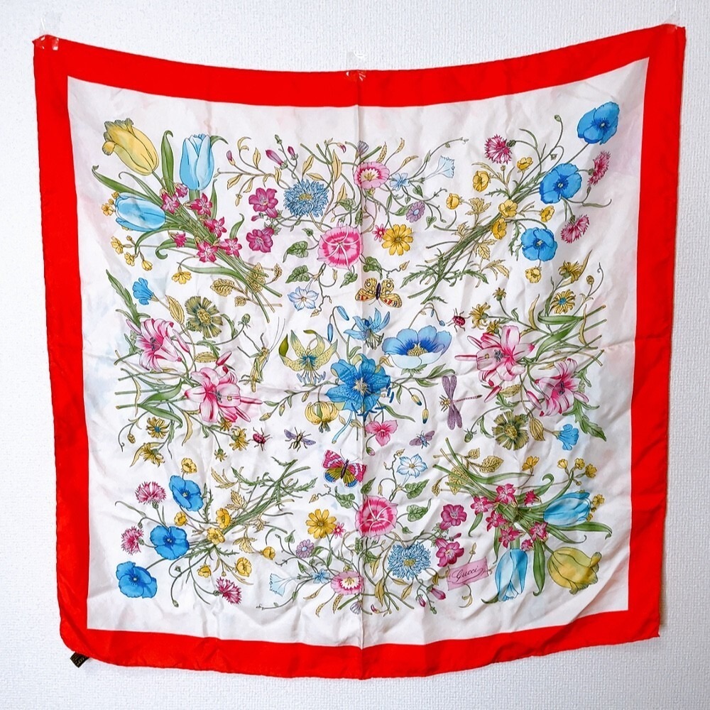 - GUCCI グッチ 大判スカーフ ショール 花柄 ボタニカル シルク レッド 美品