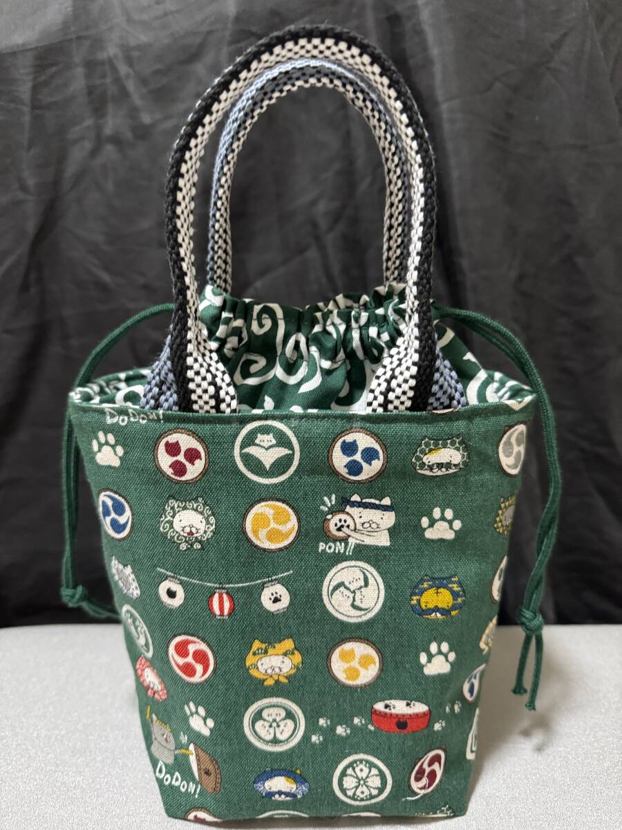 > ハンドメイド 綿麻キャンバス×帆布×シーチング 巾着付きミニミニトートバッグ 猫 / 和柄 ねこ ネコ 猫柄 WAGARA コットンこばやし