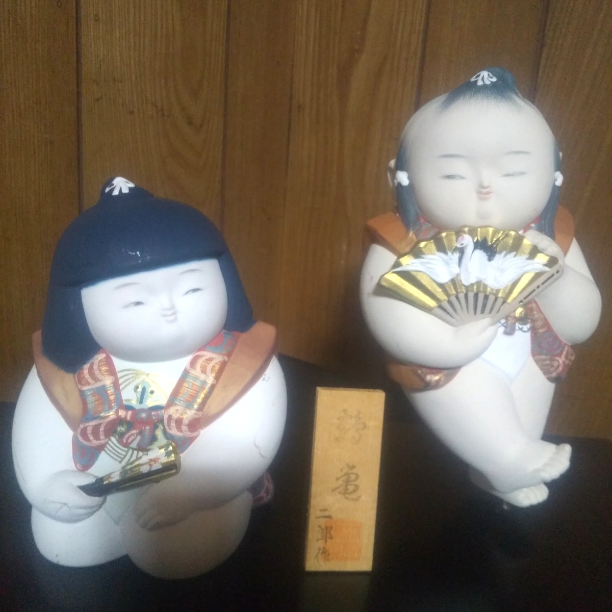 - 博多人形、鶴亀(二郎作)縁起物☆博多人形商工協同組合登録商標のシール有り☆高さ約18センチと20センチ☆ガラスケースなし★送料込み♪