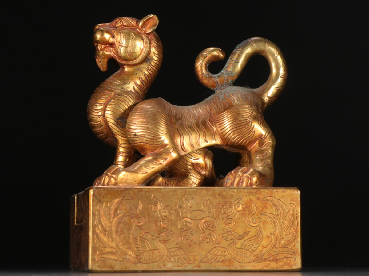 - ▽鴻▽清時代 古銅塗金彫刻 白虎鈕御璽印章セット 印鑑 時代物 中国古美術 骨董品