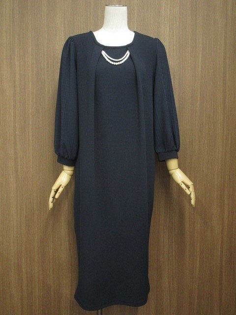 > 美品 ピュアラスト purelast ロング丈 七分袖 ラウンドネック ワンピース M ネイビー&ネイビー チェック柄