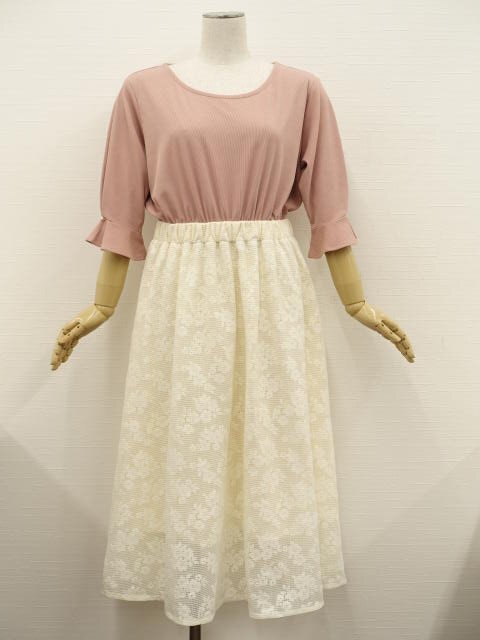 - 大きいサイズ 未使用品 マキシ丈 フリルスリーブ 七分袖 ラウンドネック レースドッキングワンピース 3L ダスティピンク×アイボリー 花柄