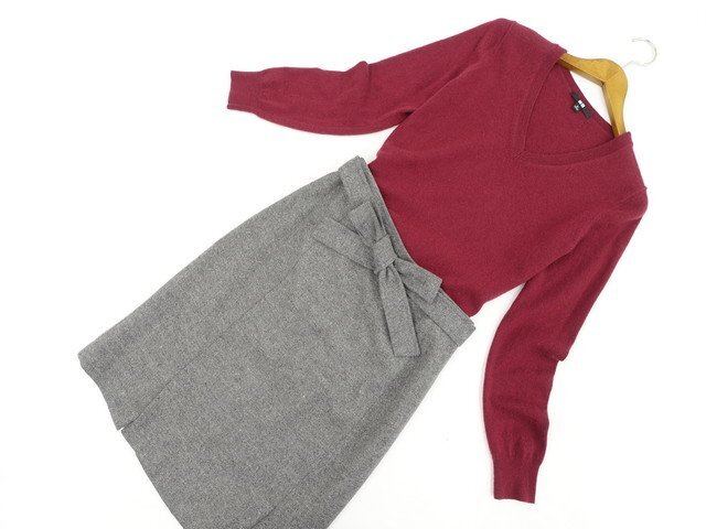 > 美品 UNIQLOなど 長袖セーター+ひざ丈タイトスカート コーディネート2点セット M相当 ボルドー/グレー系 オフィス・きれいめ系 30-40代