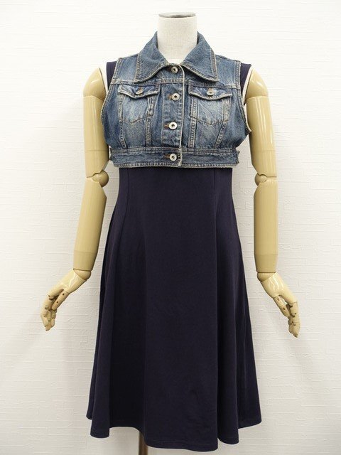 > 美品 UNIQLO等 デニムジレベスト+ひざ丈ノースリーブワンピース コーデ2点セット L相当 青系/紫系 カジュアル・シンプル系 20代・30代~