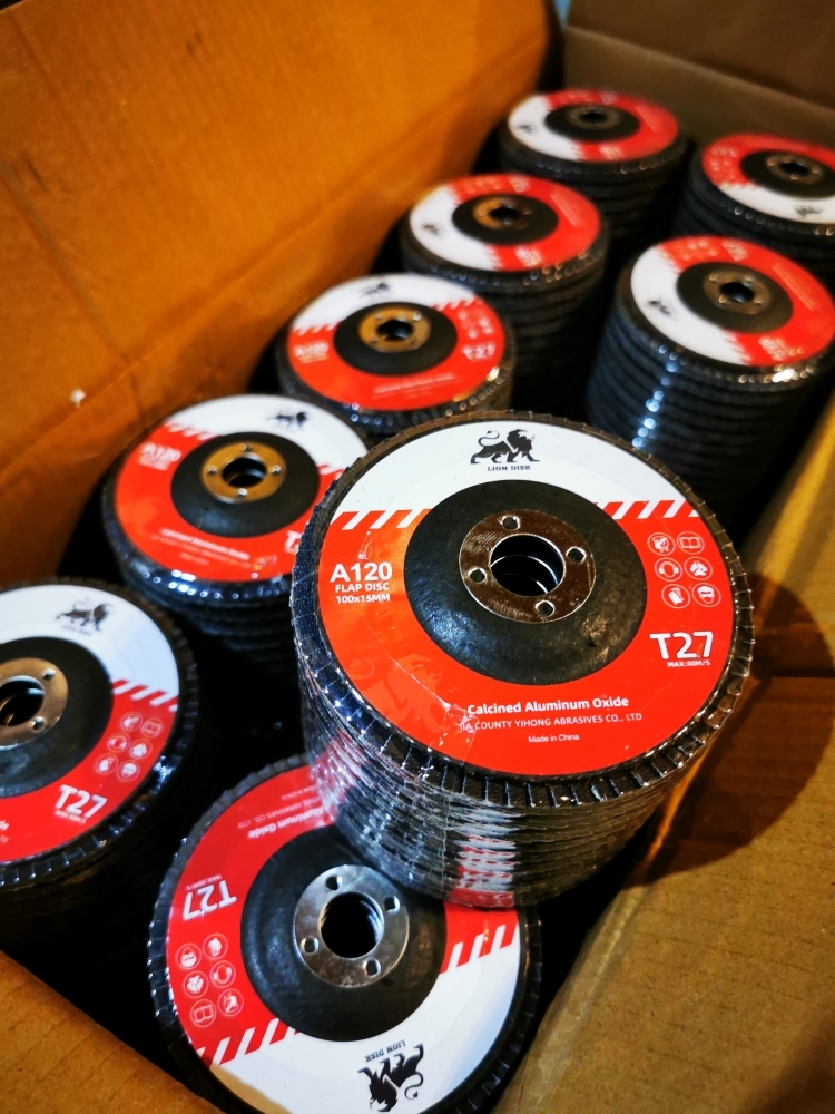 - (鉄工用) フラップディスク 200枚 荒度#120/内径15mm 100mmグラインダー用 カーボン (強化)焼成酸化アルミナ ペーパーディスク ②