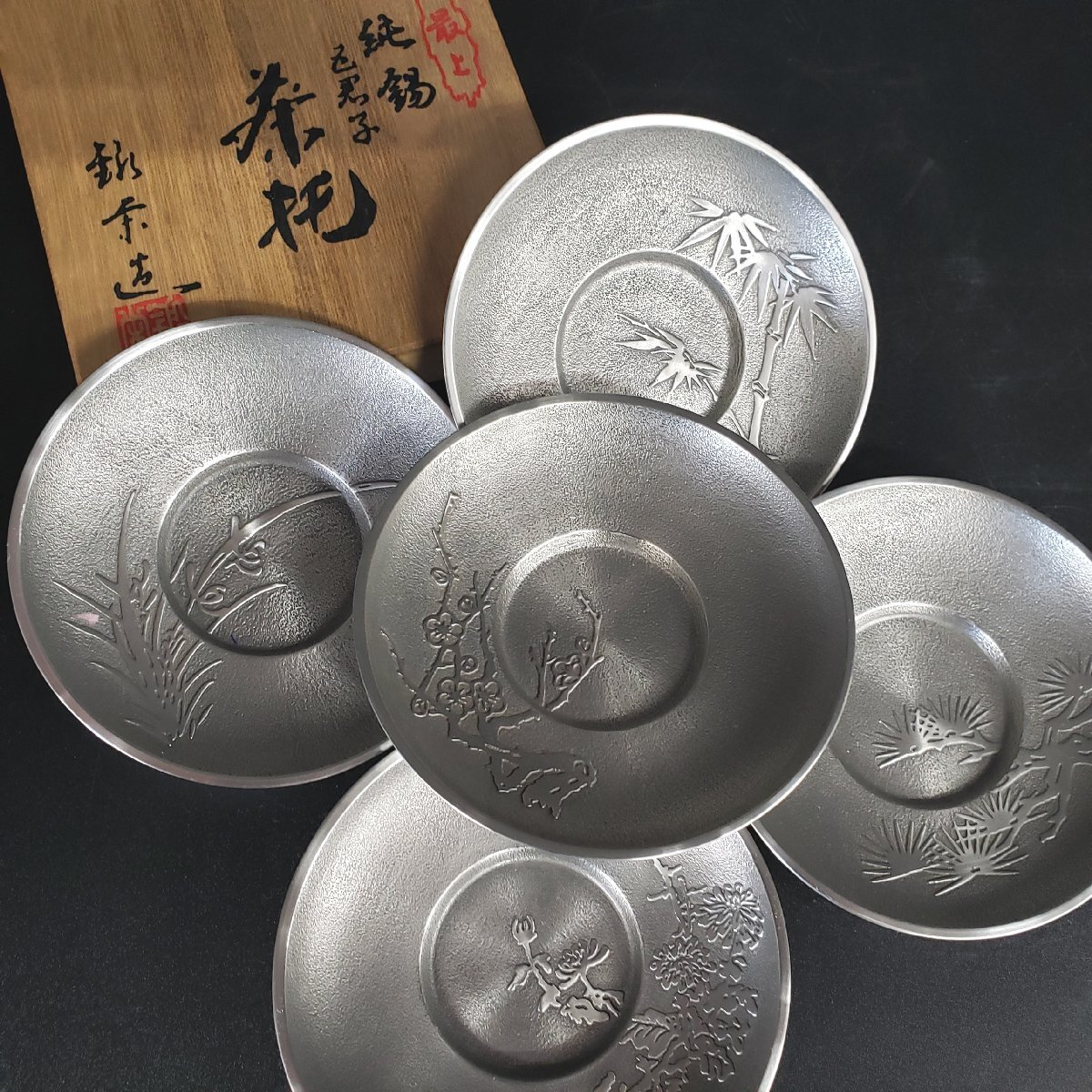 - 茶托 純錫 鍛栄造 鍛栄工房 茶托5客 花絵 松竹梅 金工細工 茶道具 煎茶道具 錫器 錫製品 美術品 骨董 時代物 レトロ 小道具【60i5349】