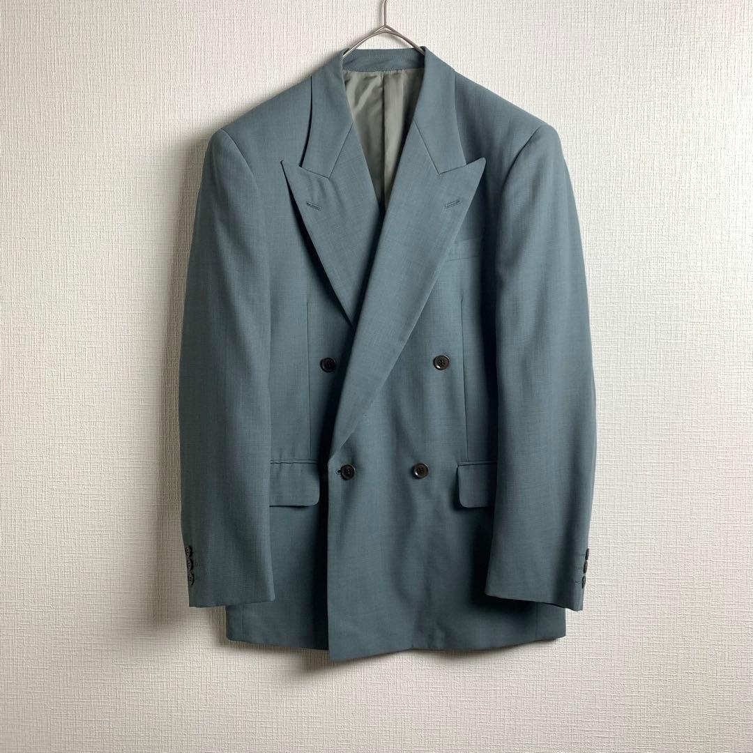 - テーラードジャケット ダブルブレスト くすみグリーン 緑 セレモニー カジュアル ビジネス メンズ 古着
