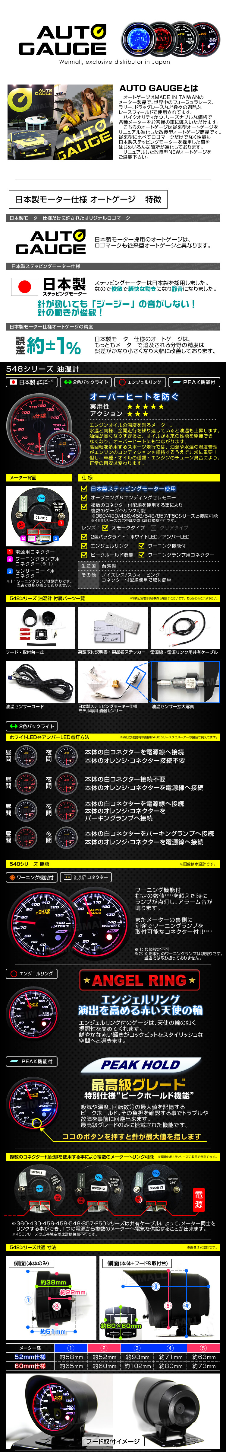 > オートゲージ 油温計 60mm 日本製ステッピングモーター ワーニング機能 ピークホールド機能 スモークレンズ AUTOGAUGE 548シリーズ
