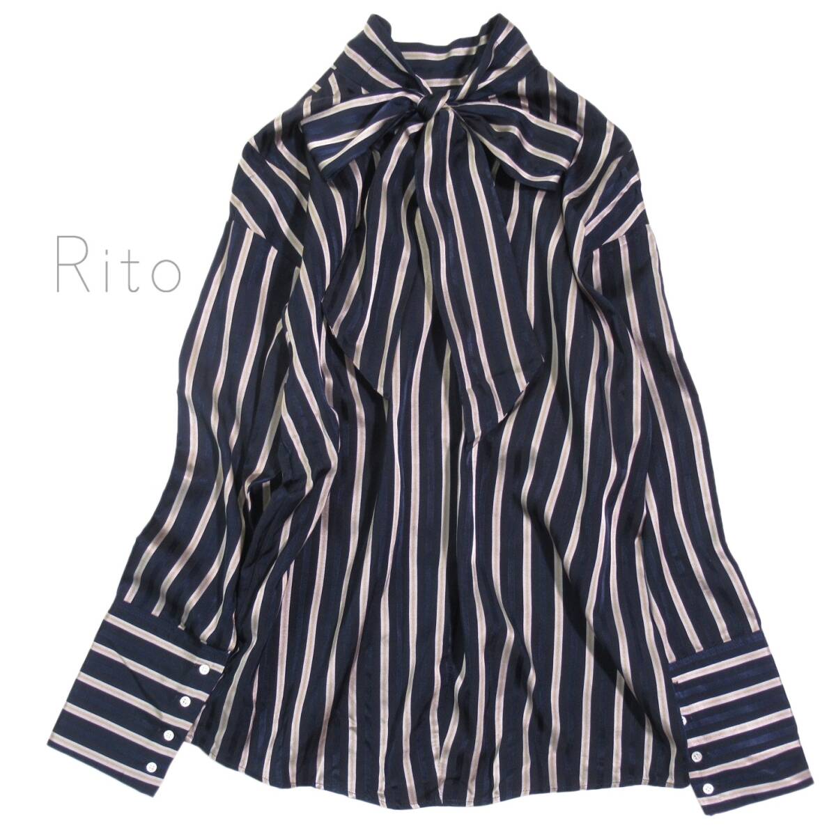 > 未使用 Rito リト 素敵 微光沢 ストライプ ビッグリボン ボウタイ デザイン プルオーバー シャツ ブラウス 38