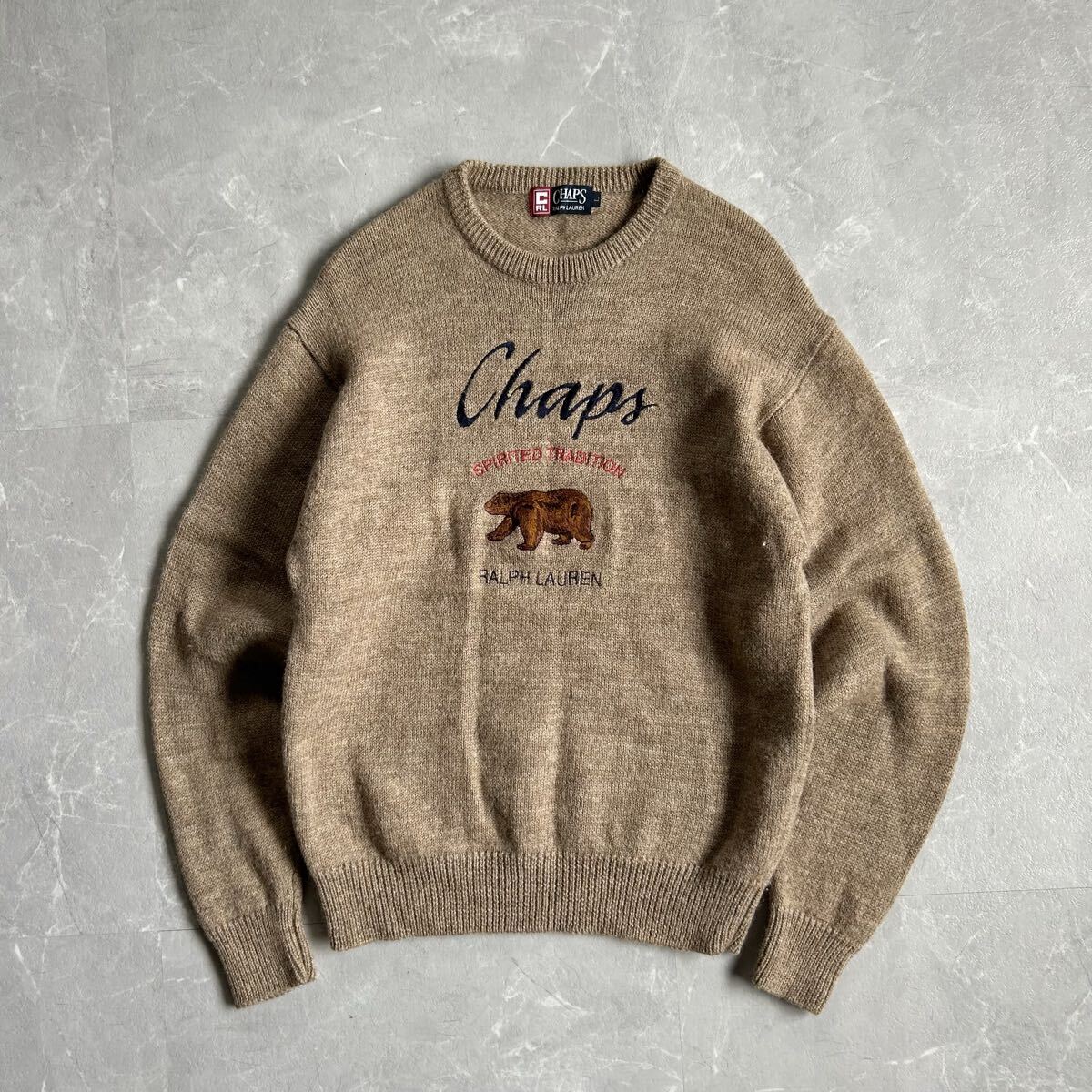 - 90s Ralph Lauren ウール ニット 刺繍 ロゴ chaps 古着 M ラルフローレン ポロベア ベージュ vintage アメリカ USA 短丈 00s cityboy POLO