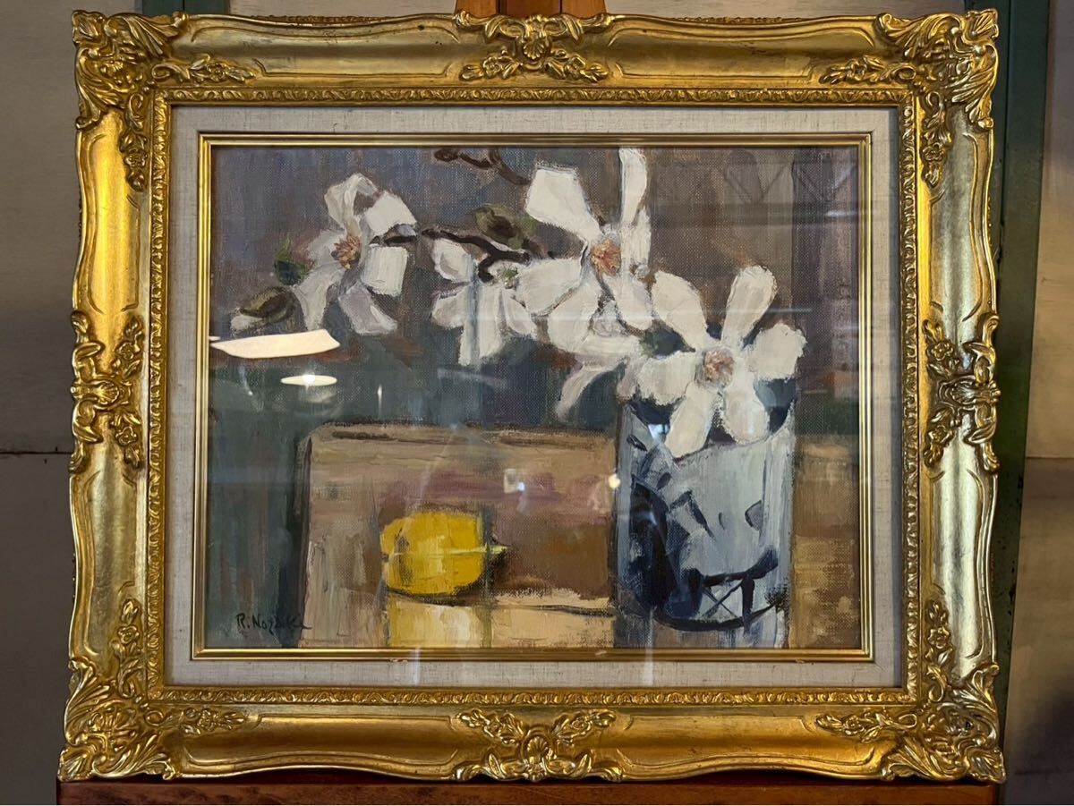 - 真作 野崎利喜男『 こぶし一枝 』 油彩 6号 静物画 花◆ 睡蓮の池美情景 〇フランス活躍画家 元一水会会員 師:マチス