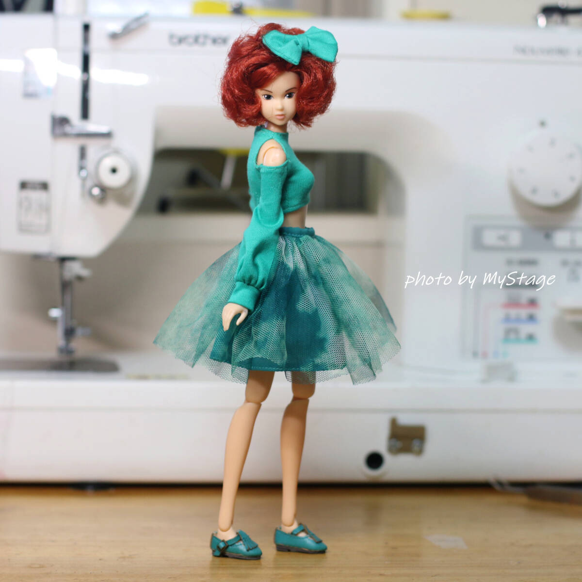 > 人形服msdr-4985 グリーンオフショルダーネックTシャツとチュールスカート(ジェニーmomoko用)
