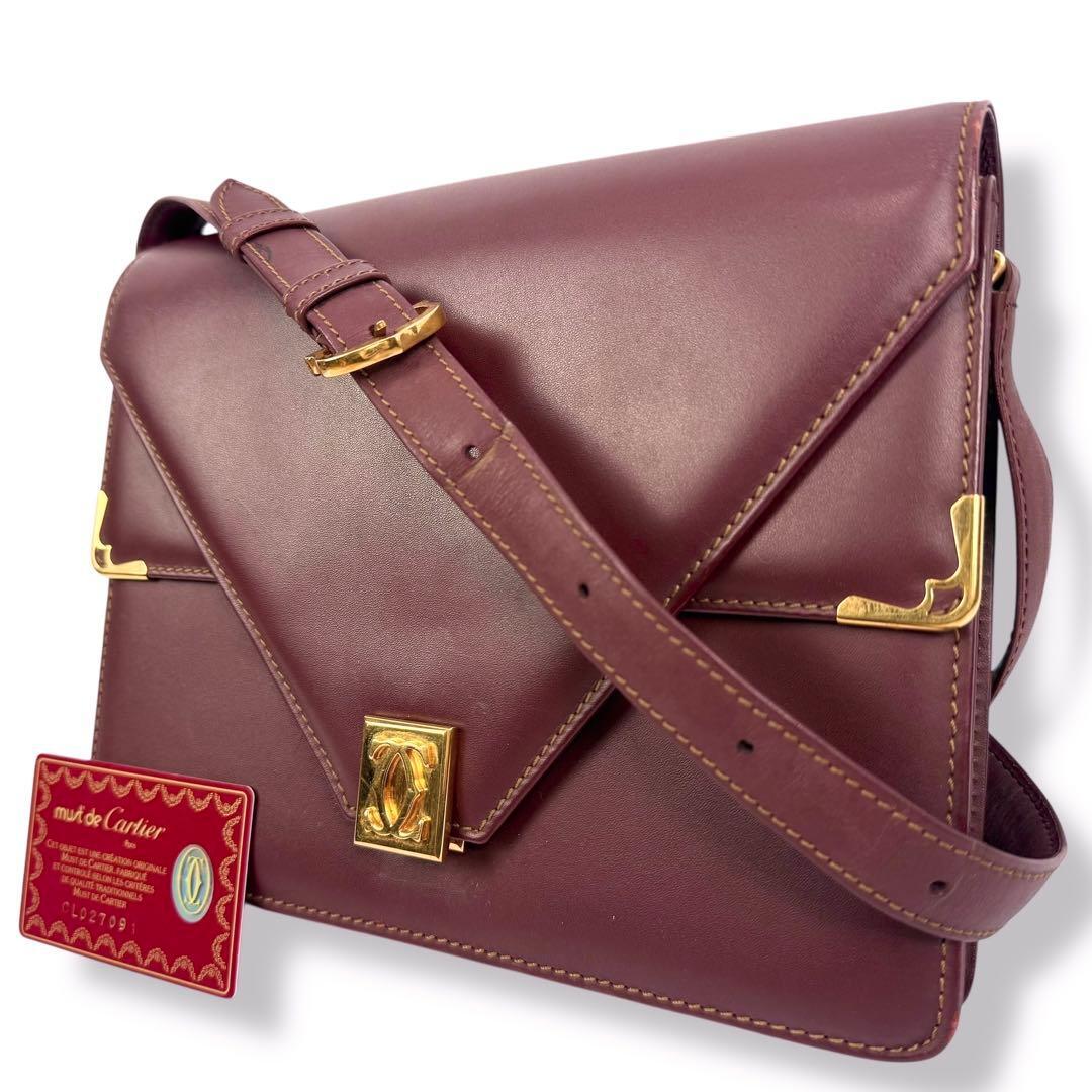 > 【Gカード付き】Cartier カルティエ ゴールド金具 マストライン ショルダーバッグ 斜めがけ ポシェット レザー 本革 ボルドー 赤 レッド