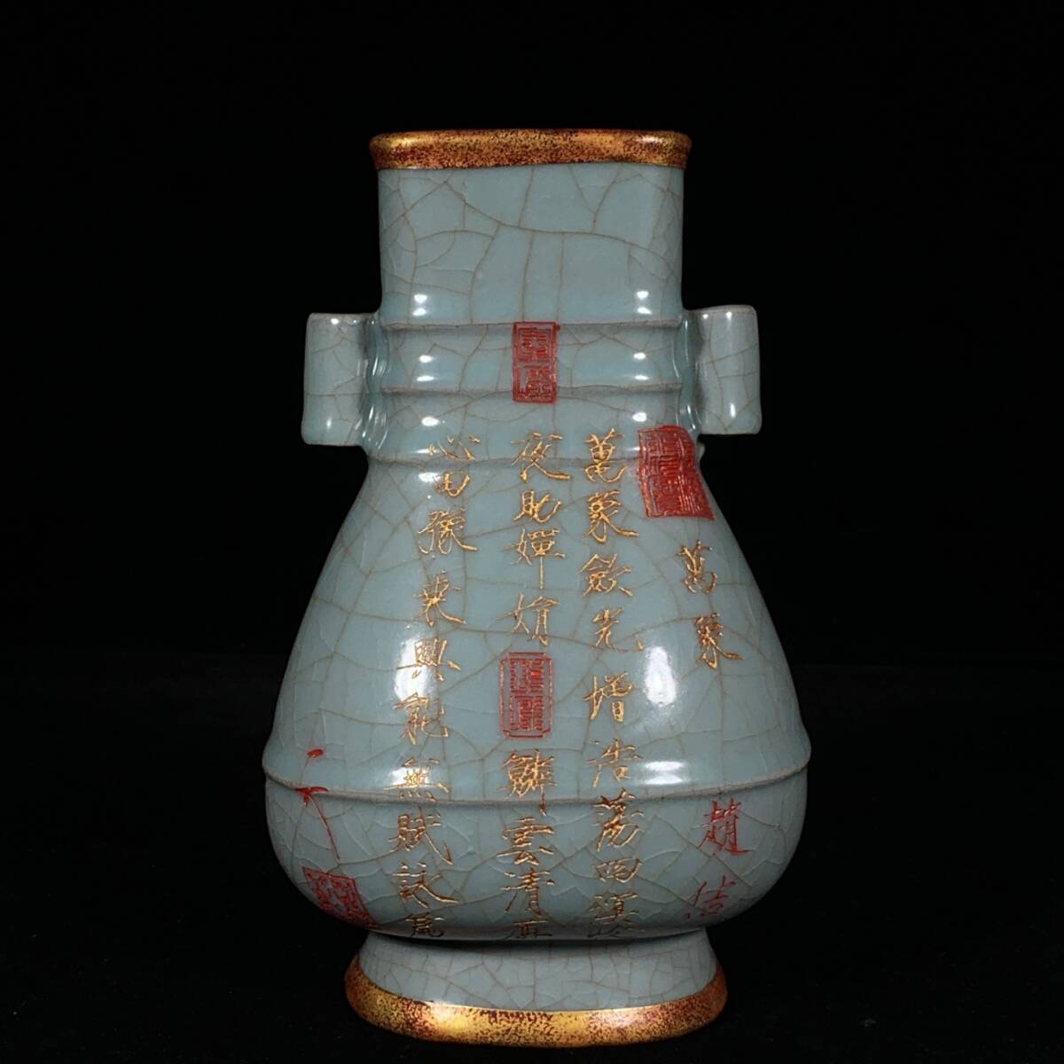> ◆珍蔵◆中国古美術 宋時代 官窯 描金 古陶磁 銘文貫耳瓶 細密細工造 置物 古賞物 骨董品 時代物 A17