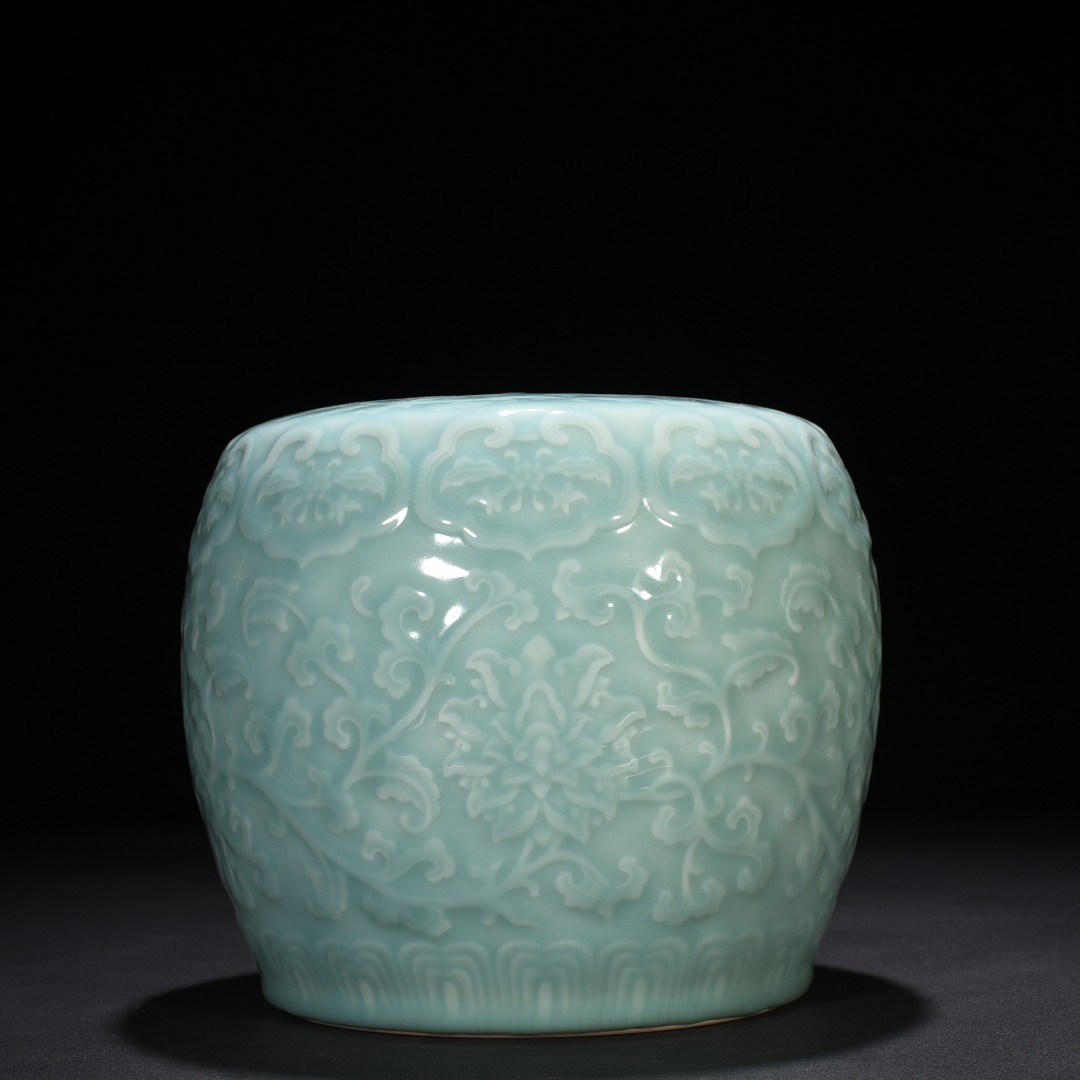 > ◆珍蔵◆中国古美術 大清乾隆年製款 粉青釉 古陶磁 高浮雕 纏枝蓮花鼓登 細密細工造 置物 擺件 古賞物 骨董品 時代物 A33