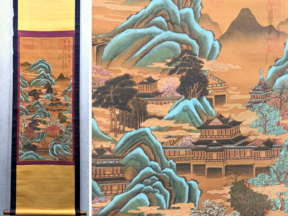- ▽鴻▽古書道【宋時代画家「趙伯駒書」絹本「山水楼閣図」】 真筆肉筆 骨董書画 掛け軸 時代物 中国古美術 骨董品