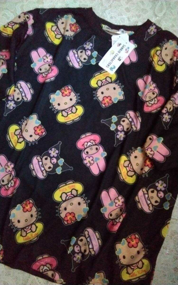 - レディース☆とっても可愛い!浮き輪に日焼けお肌の♪キティ&クロミ&マイメロちゃん☆総柄の黒色半袖Tシャツです(o^―^o)サイズL☆