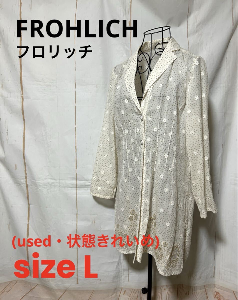 > FROHLICH フロリッチ ドット柄 刺繍 ロングカーディガン 羽織り ブラウス カットソー(used、状態きれいめ)サイズL、アイボリー×ベージュ