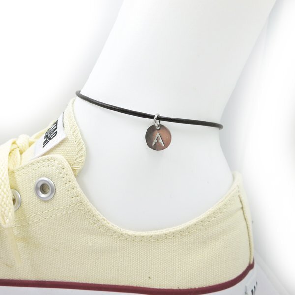 - A レザーアンクレット イニシャルチャーム付き ラウンド型 ステンレス金具 26cm(22+4cmアジャスター)