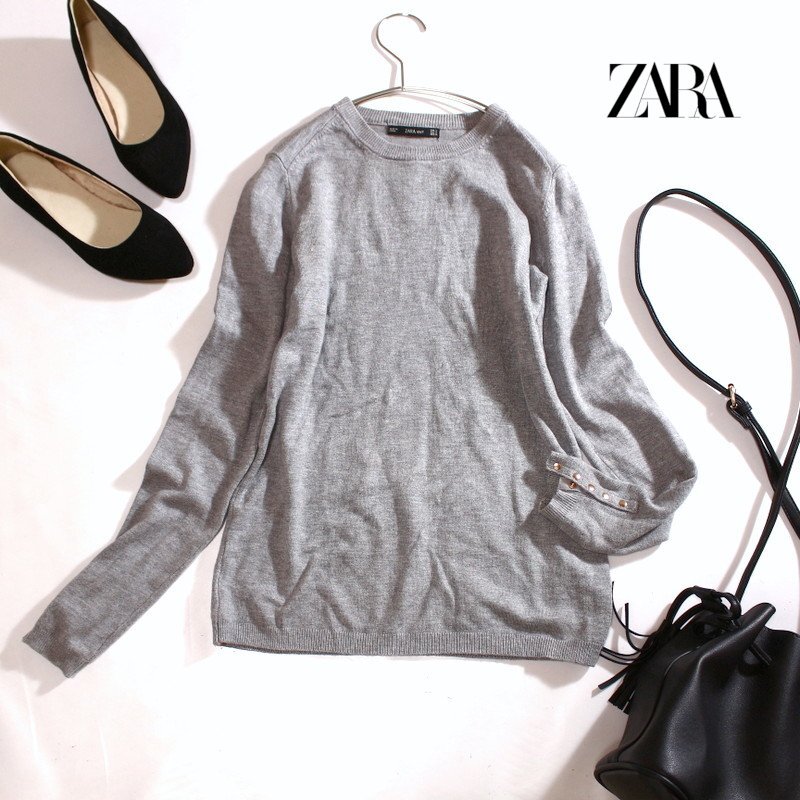 > 無地 ZARA ザラ 合物 もっちり ストレッチニット 袖ボタン ニットセーター ニットカットソー S グレー シンプル カットソー