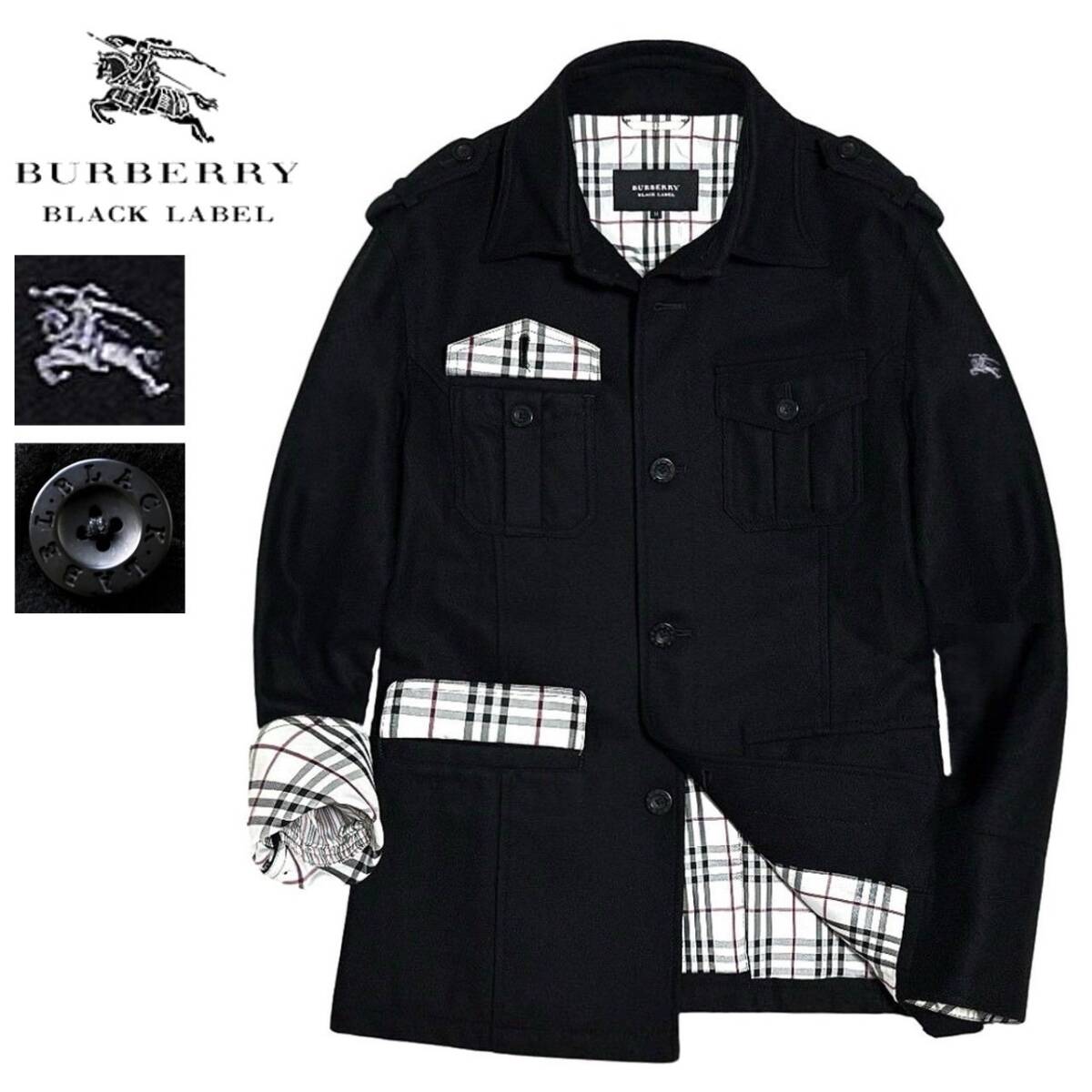 > 美品 バーバリーブラックレーベル BIGホース刺繍 襟ワイヤー 羊毛 メルトンウール M-65 ミリタリージャケット M/2 黒 BURBERRY BLACK LABEL