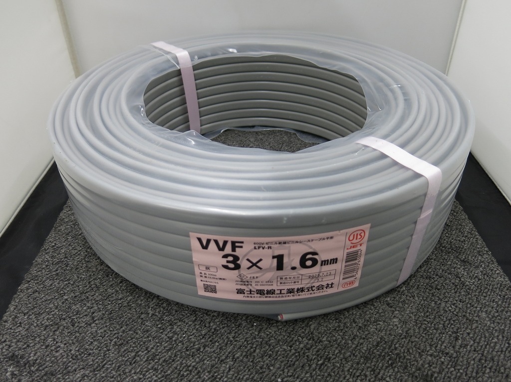 > 【未使用】 富士電線工業 【未使用】 VVFケーブル 1.6mm×3芯 100m巻(灰色)