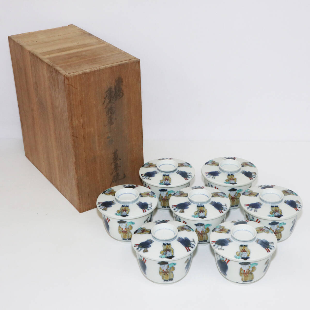 - 十二代目 酒井田柿右衛門 染錦 唐人物画 蓋茶碗 7客 共箱 蓋物 1003-7