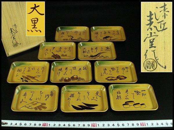 - 【金閣】漆匠 表堂 作 図替わり 四方皿 十客 共箱 旧家蔵出 送料無料(A132)