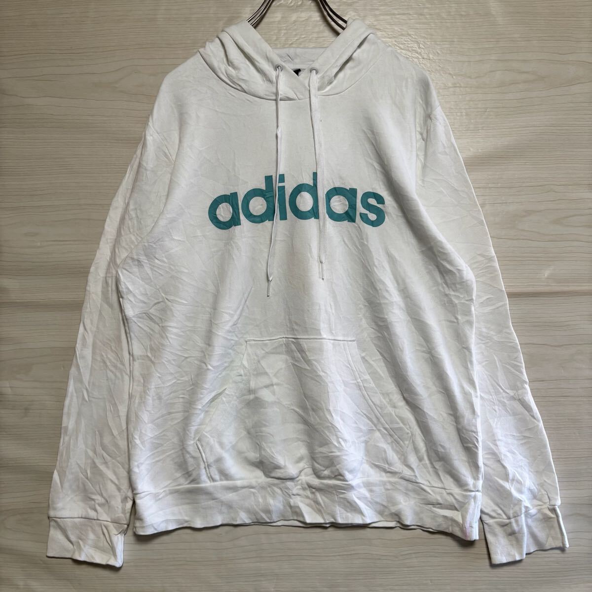 > adidas アディダス プルオーバーパーカー フーディー スウェット フロントビックロゴ サイズL ホワイト 白 コットン メンズ トップス(36)
