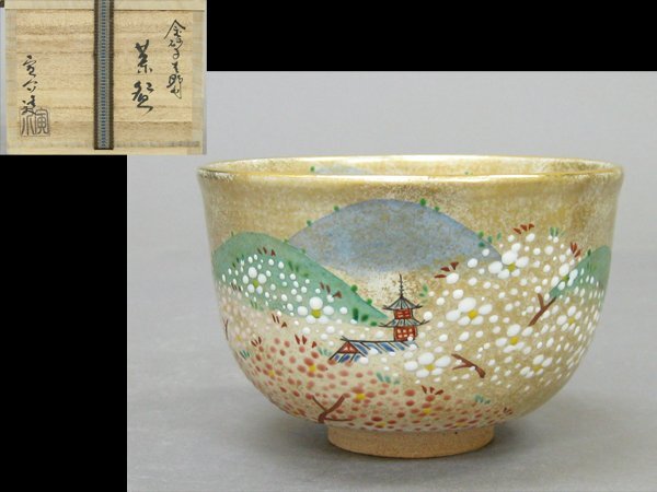 - 【心庵】京焼 小倉寅介 金砂子吉野山/茶碗 共箱 共布 陶歴 茶道具 B447
