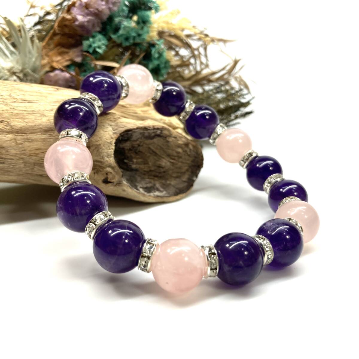 - ローズクォーツ&アメジスト パワーストーン ブレスレット 天然石ブレス (シルバー) 12mm 金運 仕事運 メンズ・レディース 男性 女性