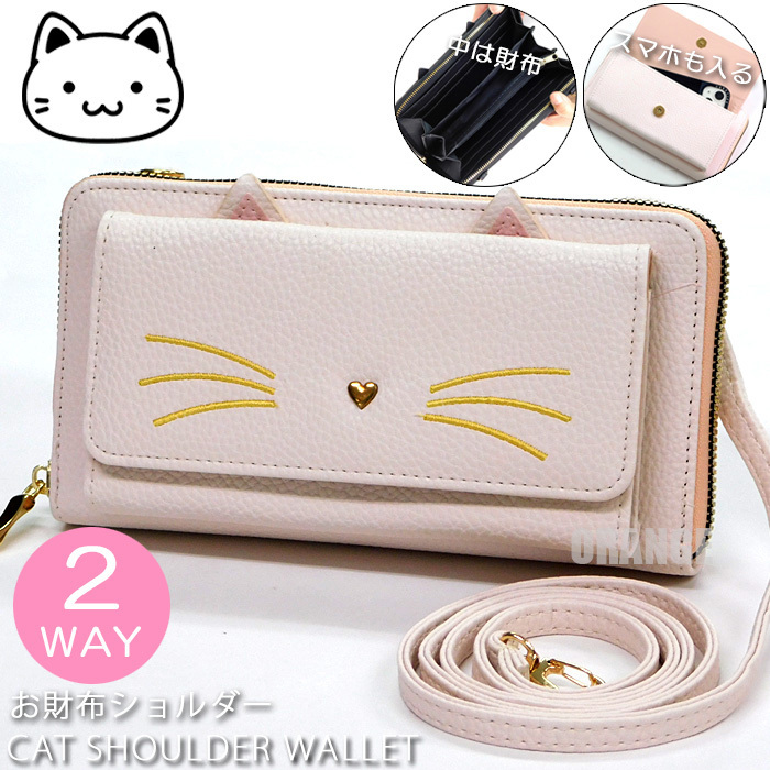 - 送料無料 ネコ 猫 フェイス型 スマホショルダー 財布 レディース ダブルファスナー 長財布 ラウンドファスナー お財布ショルダー ピンク□