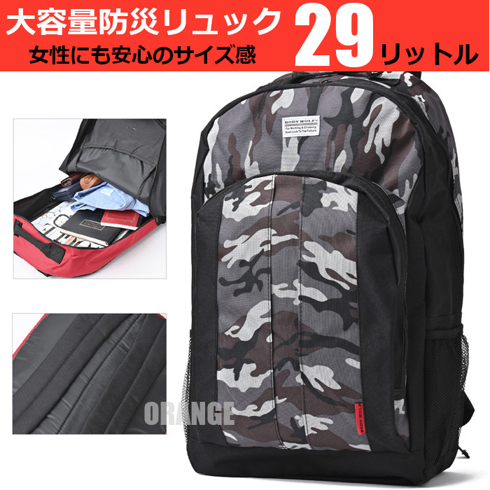 - 送料無料 大容量 29リットル 防災 リュック メンズ レディース 防災リュック 防災バッグ リュックサック 軽い 軽量 地震 台風 迷彩グレー□