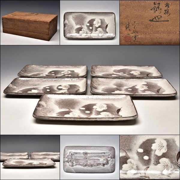 - YK00431 川合修二 桜 角皿 五客 皿 板皿 四方皿 懐石 会席 共箱