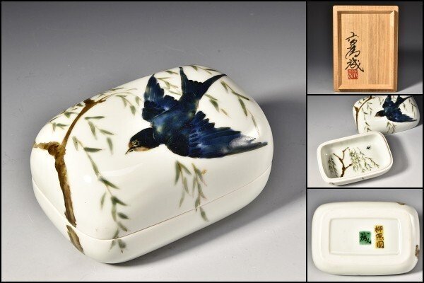 > U08417 東京芸大 高橋誠 色絵 柳燕図 長四角筥 箱 陶筥 共箱 /G125