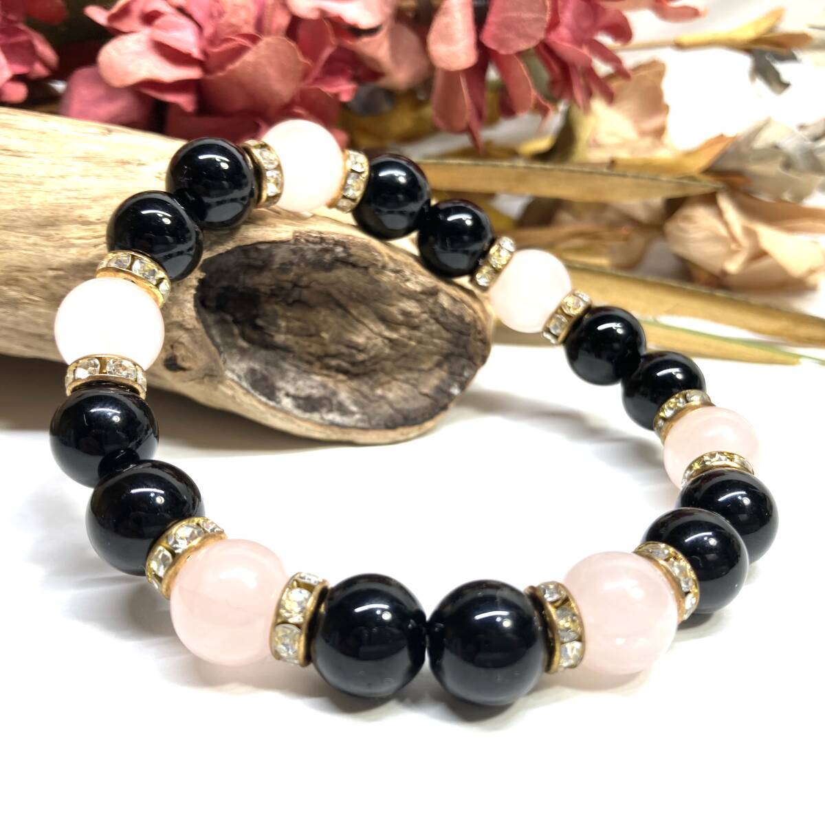 > モリオン&ローズクォーツ パワーストーン ブレスレット 天然石ブレス (ゴールド) 10mm メンズ・レディース 厄除け 恋愛運 ☆