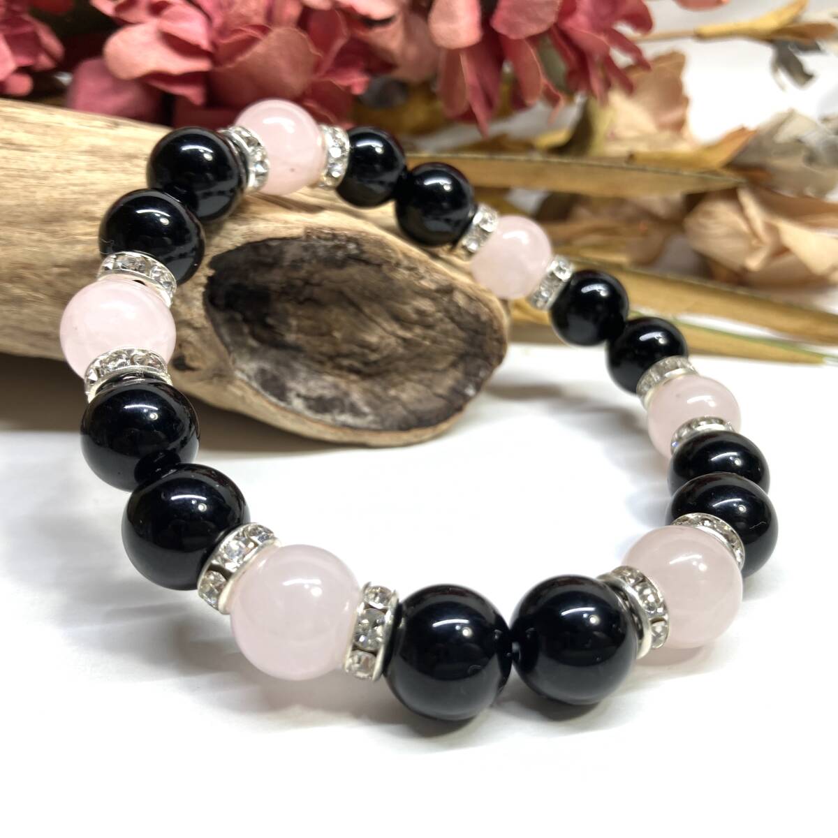 > モリオン&ローズクォーツ パワーストーン ブレスレット 天然石ブレス (シルバー) 10mm メンズ・レディース 厄除け 恋愛運 ☆