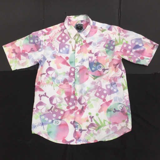 > ステューシー サイズ M 8ボール ダイス 総柄 半袖 シャツ フロントボタン トップス メンズ 白×マルチカラー STUSSY