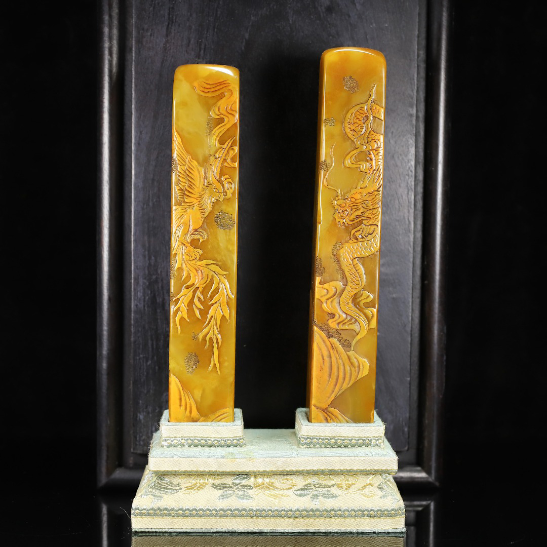 - ▽鴻▽清朝時代 寿山石 田黄石彫 龍鳳呈祥印章一対 貞松作 花梨木箱付 時代物 中国古美術 骨董品
