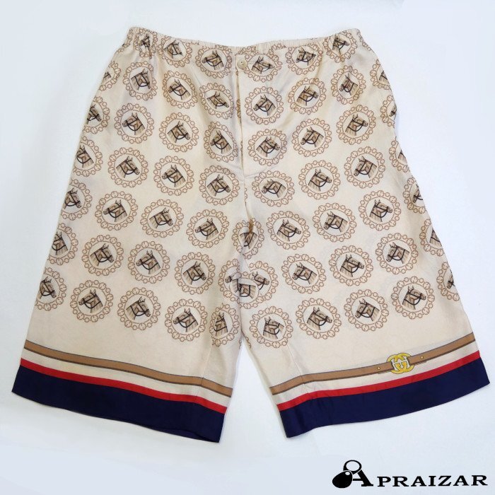 > GUCCI グッチ シルク100% 馬モチーフ プリント ハーフパンツ 44 ベージュ マルチカラー メンズ ユニセックス [77234]