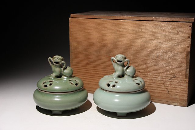- ☆撫子☆龍泉窯獅子香爐一対 (検)蓋付き 香炉 香道具 青磁 唐物 中国美術 古玩 古道具