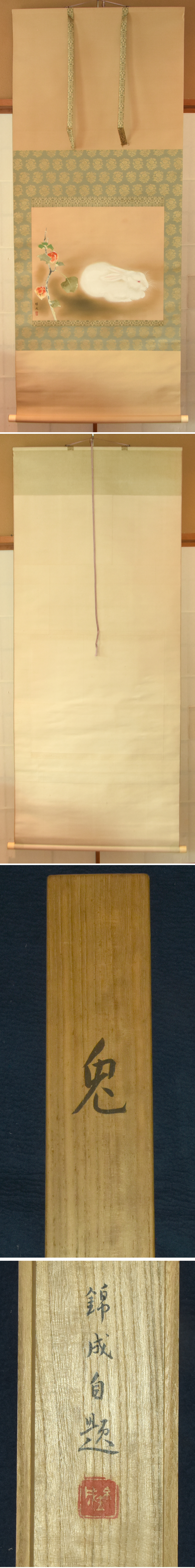 - 【真作】畠山錦成「兎図」絹本 肉筆 掛軸 共箱 書画 絵画 日本画 軸 掛け軸 u0852o