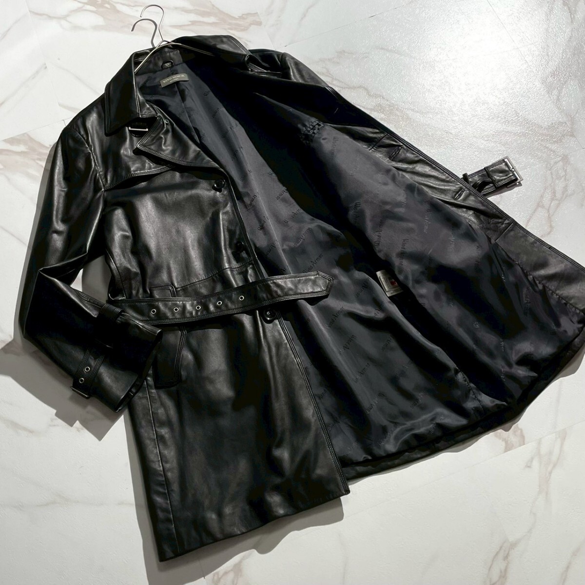 > 極美品 XL●WIND ARMOR レザートレンチコート ニチワ ラムレザー 羊革 ベルト ビジネス 仕事 通勤通学 黒 ブラック ウインドアーマー