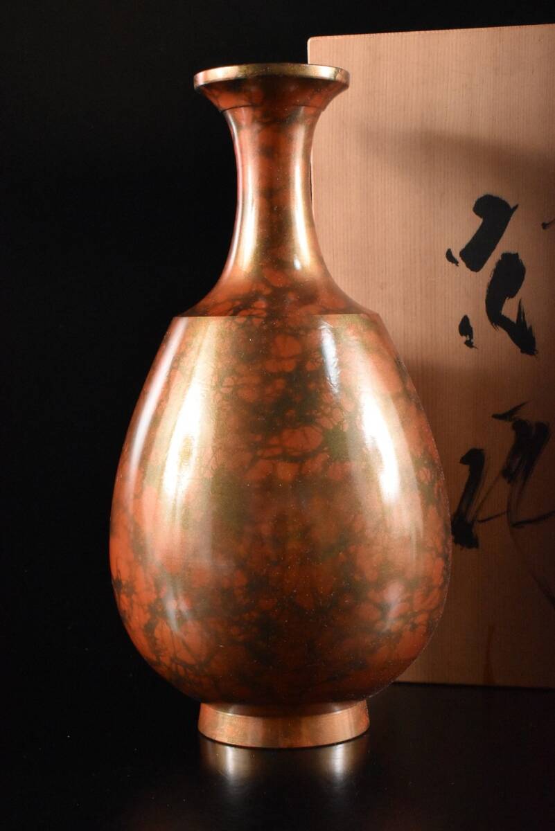- 【雲】某有名資産家収蔵品 鋳銅製 花瓶 飾壷 在銘 共箱 古美術品(花器花入旧家蔵出) F8641