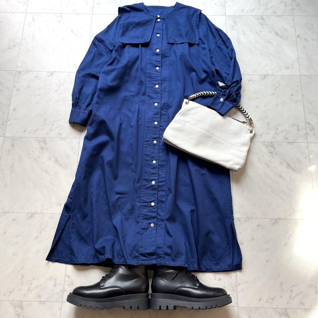 > 良品 haupia ハウピア 定価2.4万円 日本製 ロングワンピース シャツワンピース バンドカラー オーバーサイズ 付け襟 長袖 ネイビー 38