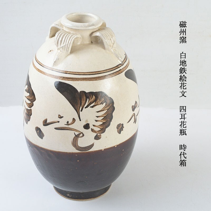 - 中国美術 磁州窯 白地鉄絵花文 四耳花瓶 時代箱 古玩 ATWN