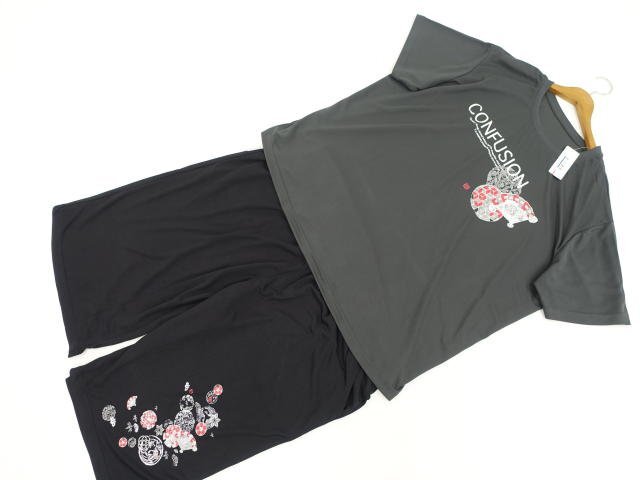 - 大きいサイズ メンズ 新品タグ付 vide et bois 半袖Tシャツ+ハーフパンツ ジャージ上下2点セット 6L ダークグレー地 和柄/黒地 和柄