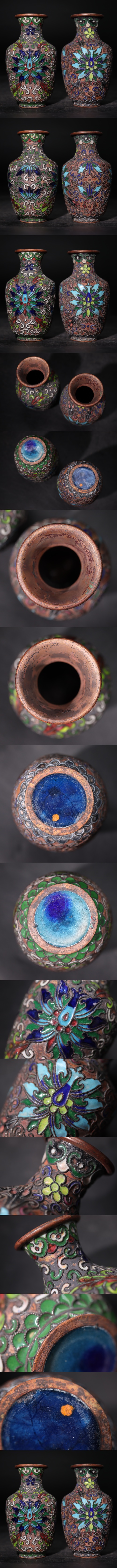 - 時代 銅胎 古七宝 花紋 徳利 二客 / 中国美術 七宝 彫金 金工 酒器 小壺 煎茶道具 煎茶飾 .G2910